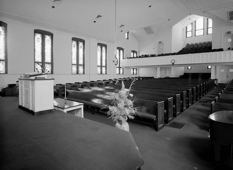 King led the Southern Christian Leadership Conference and later became co-pastor with his father at Ebenezer Baptist Church in Atlanta (pulpit and sanctuary pictured) – Public Domain
