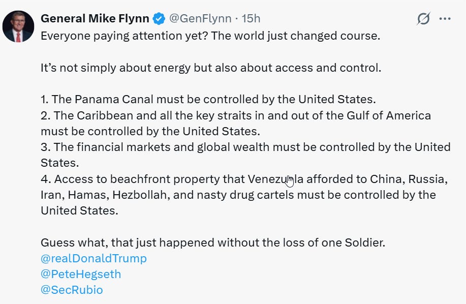 Yet, as analysts note, the operation extends beyond narcotics enforcement. It reflects a broader strategy to counter foreign influences in the Western Hemisphere, particularly from Russia and China, which have deepened ties with Venezuela through military deployments, investments, and resource deals. Retired Lt. Gen. Michael Flynn, in a recent social media post, outlined key U.S. priorities: control of the Panama Canal, Caribbean straits, financial markets, and Venezuelan assets previously accessible to adversaries like China, Russia, Iran, Hamas, Hezbollah, and drug cartels. Flynn’s comments, invoking a “new Manifest Destiny,” align with appointments such as Pete Hegseth as Secretary of War and Marco Rubio in a senior role, emphasizing access and control.
