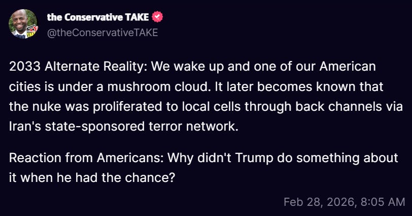 To illustrate the stakes, consider a hypothetical 2033 scenario. Imagine intelligence confirms that nuclear material proliferated through proxy networks linked to a regime that crossed the nuclear threshold years earlier. Imagine Americans asking why stronger measures were not taken when there was still time to prevent it. That scenario is not presented as inevitability, but as the risk calculation underlying preemptive arguments.