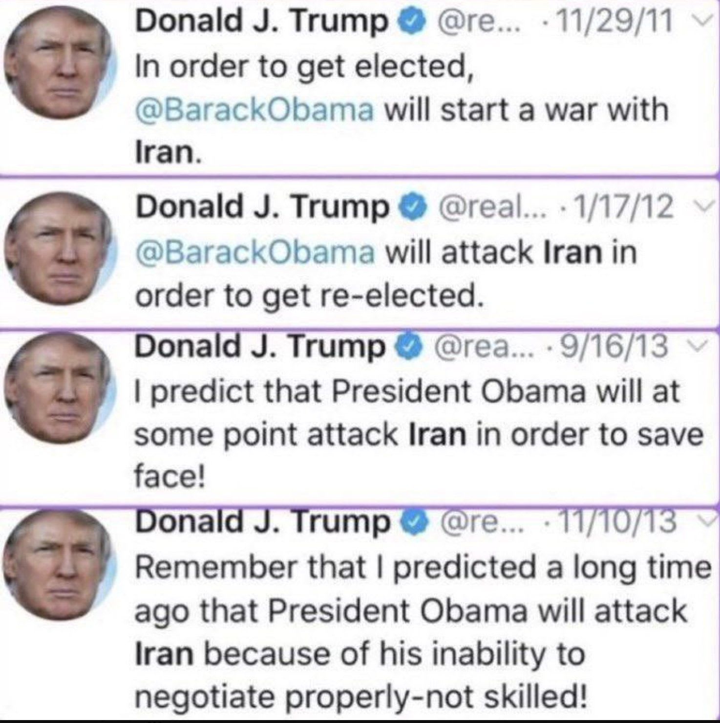 May be an image of the Oval Office and text that says 'Donald J. Trump @re... In order to get elected, @BarackObama will start a war with Iran. 11/29/11 9/16/13 Obama will at Donald J. Trump @real... 1/17/12 @BarackObama will attack Iran in order to get re-elected. Donald J. Trump Trump @rea... I predict that President some point attack Iran in order to save face! Donald J. Trump @re... -11/10/13 Remember that I predicted a ong time ago that President Obama will attack Iran because of his inability to negotiate properly-not skilled!'