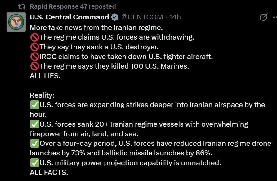 Translation: There is zero need for American troops on the ground. We have a population inside Iran that is able, willing, and eager to fight. Team Trump has planned this like a masterclass.