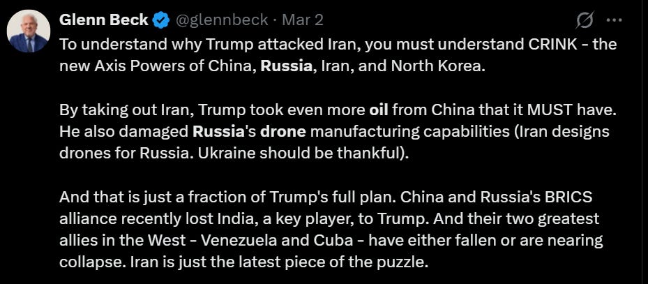 The “Panicans” (those loud, fear-driven conservatives like Tucker Carlson, Candace Owens [full discloser: we once had a high opinion her but none of this article reflects points from our 2021 video], Col. Douglas Macgregor, Dave Smith, and Thomas Massie) suck at reading the room right now. They’re panicking like it’s 2003 all over again, screaming “forever war!” the second Trump hits Iran. They see missiles flying and immediately cry “Iraq! Neocons! Blood for oil!”