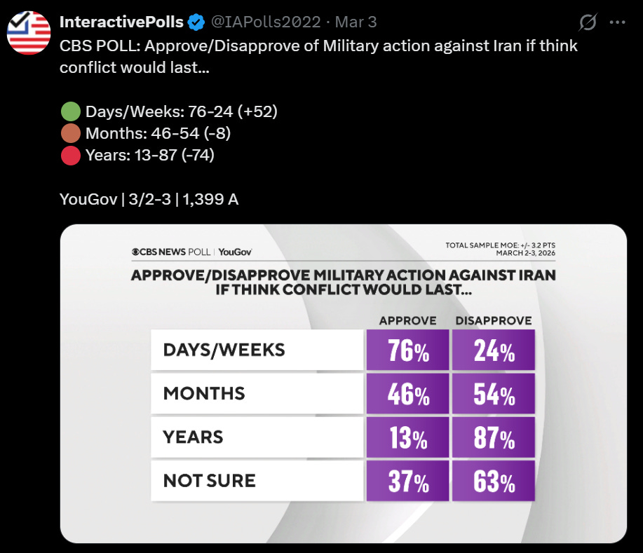Panicans are so consumed by their seething Trump hatred that they literally refuse to look at the actual numbers on issues they personally don’t like. CBS just dropped a bombshell poll showing 76% of Americans support Operation Epic Fury if it lasts only days or weeks. That’s a straight-up 80/20 landslide, higher than support for border security.